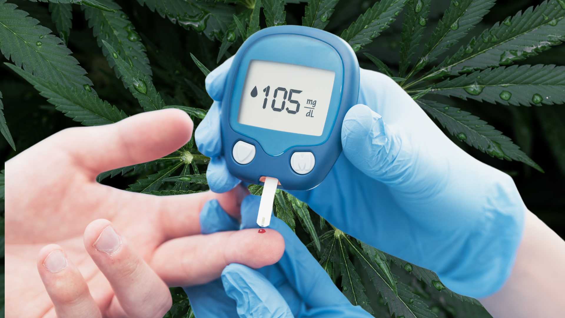 Gloved hands testing blood sugar with a glucometer against a cannabis leaf background, symbolizing marijuana for diabetes.