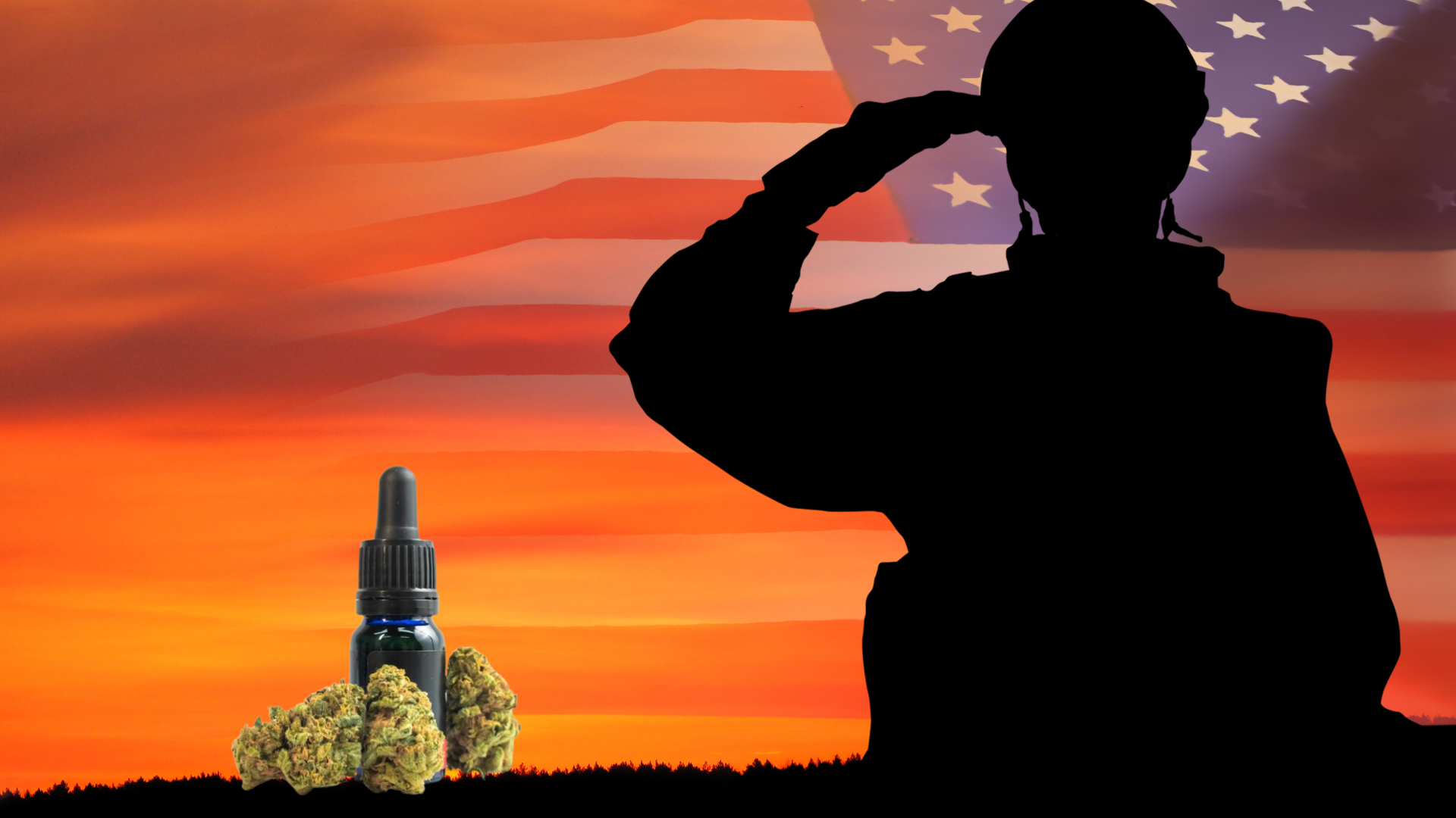 Silhouette of a saluting veteran with cannabis oil and buds in front of a sunset and American flag, symbolizing MMJ for veterans.